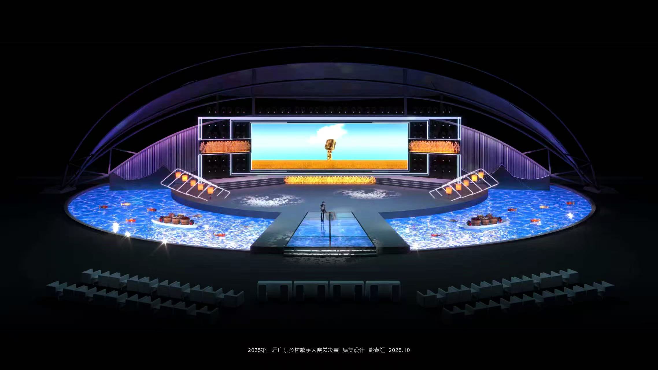 值得一提的是,本次总决赛舞台设在广州增长广场地标永久舞台,以“大地之歌·丰收舞台”为主题,将乡村美景直接搬上了舞台。整体设计融合了现代科技与传统元素,打造出一个池水环绕、层次丰富的表演空间。