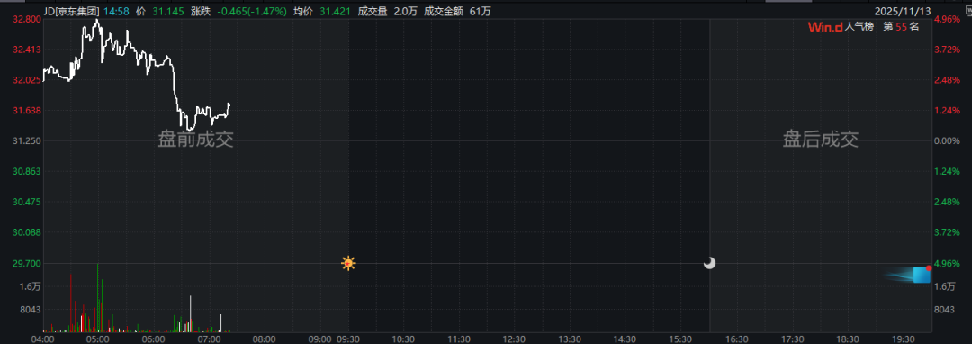 11月13日,京东集团发布2025年三季度业绩。财报显示,三季度,京东集团收入为2991亿元,同比增长14.9%,超出预期。当天美股盘前,京东股价一度涨近5%,截至发稿,涨幅收窄至约2.5%。